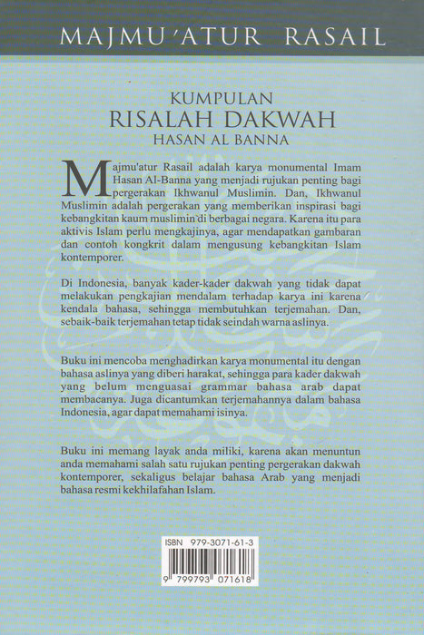 Majmu’atur Rasail adalah karya monumental Imam Hasan Al-Banna yang menjadi rujukan penting bagi pergerakan ikhwanul musliman. Dan, Ikhwanul Muslimin adalah pergerakan yang memberikan inspirasi bagi kebangkitan kaum muslimin di berbagai negara. Karena itu para aktivis islam perlu mengkajinya., agar mendapatkan gambaran dan contoh konkrit dalam mengusung kebangkitan islam kontemporer. Buku ini memang layak Anda miliki, karena akan menuntun Anda memahami salah satu rujukan penting pergerakan dakwah kontemporer, sekaligus belajar bahasa Arab yang menjadi bahasa resmi kekhilafahan Islam.
